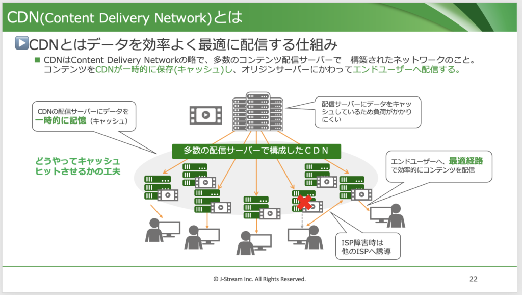 キャッシュとは、「処理したデータを一時的に保存し、次回以降のアクセスを高速化する仕組み」です。この仕組みをCDNが使っているために配信の大規模配信が実現できていることを説明しました。