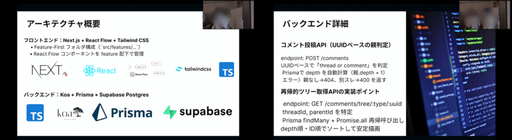 ツリー構造を保つためのロジック設計や、フロントエンドとバックエンドの分離など、モダンな開発スタイルも取り入れられており、技術的な完成度の高さもJストリーム賞選考時のポイントとなりました。